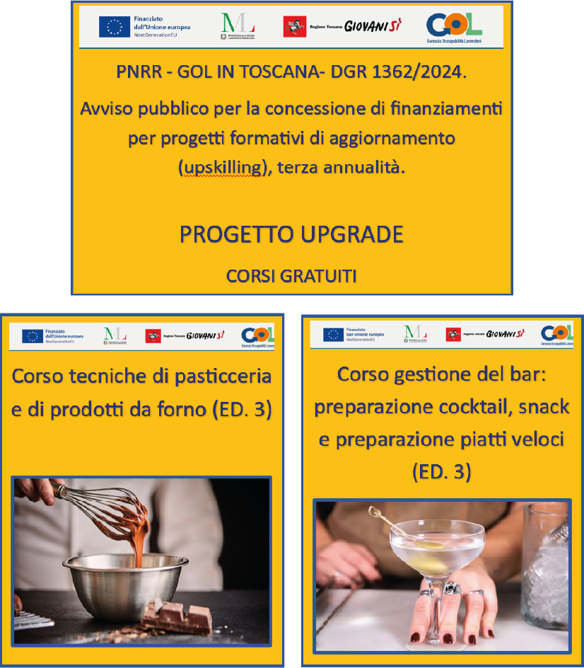 PNRR – GOL IN TOSCANA – DGR 1362/2024 Avviso pubblico per la concessione di finanziamenti per progetti formativi di aggiornamento (upskillung), terza annualità. PROGETTO UPGRADE CORSI GRATUITI Clicca qui per informazioni sul corso tecniche di pasticceria e di prodotti da forno Clicca per tutte le informazioni sul corso gestione del bar Torna alla Home